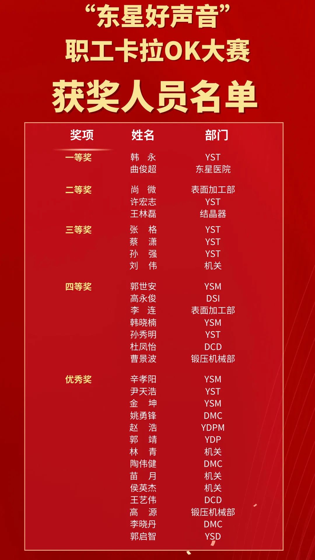 讓青春與熱情對(duì)話(huà),讓歌聲與夢(mèng)想放飛!為了打造健康文明、奮發(fā)昂揚(yáng)的企業(yè)文化氛圍,豐富員工們的業(yè)余文化生活,深入挖掘集團(tuán)公司優(yōu)秀藝術(shù)人才,展現(xiàn)東星職工的個(gè)人魅力與風(fēng)采,8月27日下午14:30,伴隨著動(dòng)感的音樂(lè)和燈光秀,“東星好聲音”職工卡拉OK大賽決賽在煙臺(tái)開(kāi)發(fā)區(qū)萬(wàn)行廣場(chǎng)盛世華堂宴會(huì)酒店激情開(kāi)唱。集團(tuán)公司副董事長(zhǎng)、副總經(jīng)理厲強(qiáng),副總經(jīng)理王建全,總經(jīng)理助理宮明杰以及集團(tuán)本部各單位和各長(zhǎng)投單位的主管領(lǐng)導(dǎo)觀看了比賽。煙臺(tái)首鋼豐田工業(yè)空調(diào)壓縮機(jī)有限公司總經(jīng)理渡邊靖也親臨比賽現(xiàn)場(chǎng)為選手們加油助威。 本次大賽歷時(shí)近一個(gè)月的時(shí)間,共有來(lái)自15個(gè)單位的57名選手參加了海選。8月12日,集團(tuán)公司工會(huì)在機(jī)關(guān)二樓會(huì)議廳組織了預(yù)選賽,在預(yù)賽的30名選手中,評(píng)選出16名晉級(jí)決賽。為了體現(xiàn)公開(kāi)、公平、公正的辦賽原則,決賽特邀了5位在國(guó)家級(jí)、省市級(jí)各項(xiàng)音樂(lè)賽事中獲獎(jiǎng)的專(zhuān)業(yè)評(píng)委現(xiàn)場(chǎng)在線(xiàn)評(píng)分,同步上傳至大屏幕,使參賽選手和觀眾們能夠第一時(shí)間了解到每位選手的得分情況。 音樂(lè)沒(méi)有國(guó)界,它可以穿越時(shí)空,跨越年代。在比賽現(xiàn)場(chǎng),選手們的演唱曲目豐富多彩,從90年代的《新不了情》《刀劍如夢(mèng)》到如今的當(dāng)紅流行歌曲《光年之外》《最美的太陽(yáng)》;從唱出一名軍嫂內(nèi)心故事的《妻子》到鼓舞人心、令人向上的英文歌曲《You Raise Me Up》;從獨(dú)唱到樂(lè)隊(duì)伴奏演唱……選手們的表演風(fēng)格各異,精彩紛呈,不同時(shí)代的音樂(lè)就像時(shí)光穿梭機(jī),帶領(lǐng)大家重溫經(jīng)典,感受時(shí)代的變遷。 鍛壓機(jī)械部 曹景波 《感謝》 表面加工部 李連 《站在草原望北京》 結(jié)晶器 王林磊 《最美的太陽(yáng)》 YSM 韓曉楠 《終于等到你》 YSM 郭世安 《海闊天空》 YST 張格 《新不了情》 表面加工部 尚微 《妻子》 YST 蔡瀟 《刀劍如夢(mèng)》 DCD 杜鳳怡 《恰似你的溫柔》 YST 孫秀明 《故鄉(xiāng)》 YST 許宏志 《領(lǐng)悟》 機(jī)關(guān) 劉偉 《YOU RAISE ME UP》 DSI 高永俊 《我是真的愛(ài)上你》 東星醫(yī)院 曲俊超 《千百年后誰(shuí)還記得誰(shuí)》 YST 孫強(qiáng) 《光年之外》 YST 韓永 《天邊》 最終,來(lái)自YST的韓永和東星醫(yī)院的曲俊超獲一等獎(jiǎng);尚微、許宏志、王林磊獲二等獎(jiǎng);張格、蔡瀟、孫強(qiáng)、劉偉獲三等獎(jiǎng);郭世安等7名選手獲四等獎(jiǎng);晉級(jí)預(yù)賽的辛孝陽(yáng)等14名選手獲優(yōu)秀獎(jiǎng)。出席活動(dòng)的領(lǐng)導(dǎo)給獲獎(jiǎng)選手們頒獎(jiǎng)并合影留念。