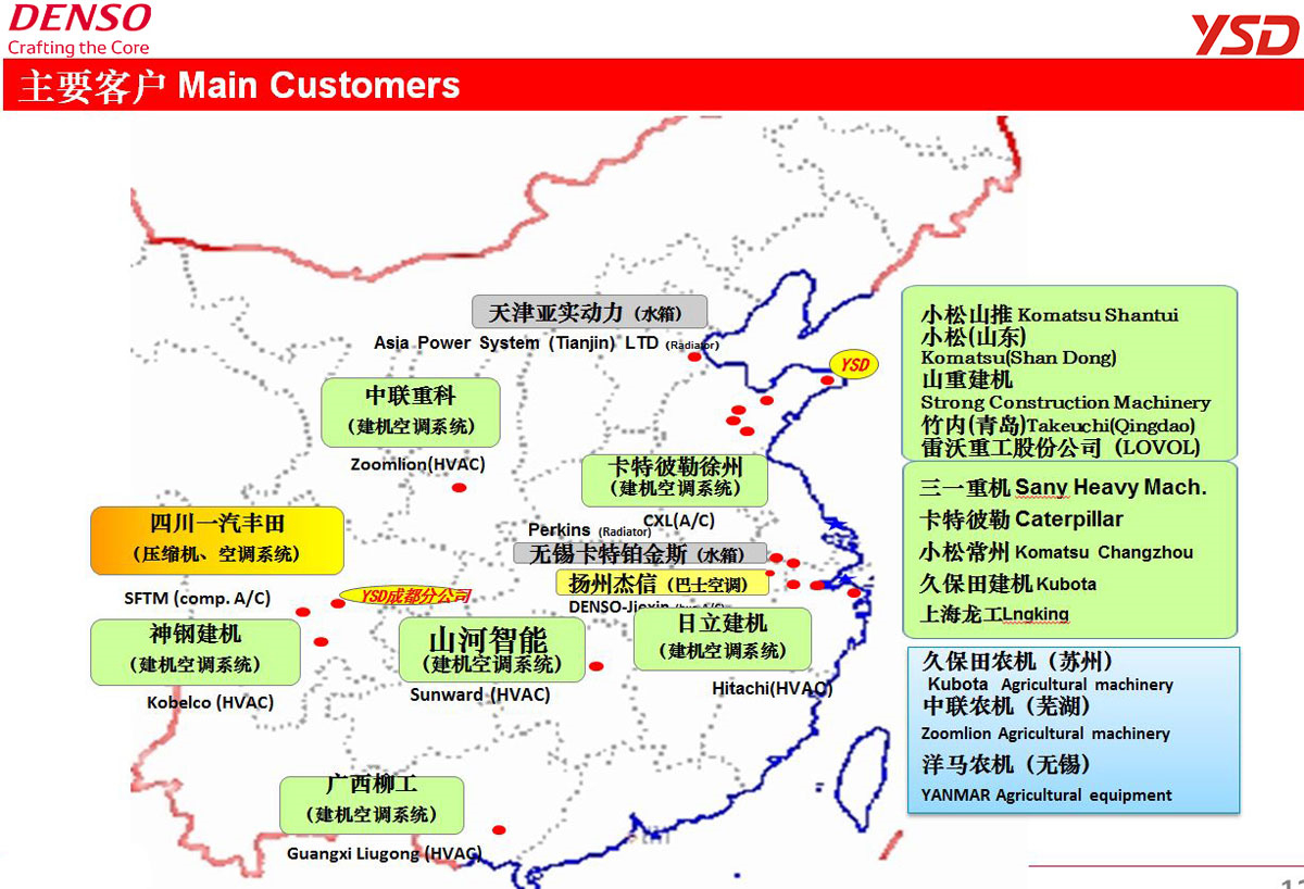 煙臺(tái)首鋼電裝有限公司(簡(jiǎn)稱:YSD)是株式會(huì)社電裝與首鋼集團(tuán)有限公司共同出資創(chuàng)建的汽車(chē)零部件企業(yè),成立于1994年12月,是株式會(huì)社電裝在中國(guó)的第一家合資公司。公司投資總額為40億日元,注冊(cè)資本13.49億日元。主要生產(chǎn)、研究開(kāi)發(fā)并銷(xiāo)售轎車(chē)、建機(jī)、通訊基站、農(nóng)機(jī)用空調(diào)全系統(tǒng)和水箱及其部品。目前YSD擁有員工257名(截止2013年7月),年銷(xiāo)售額4個(gè)億,主要客戶豐田、本田、卡特彼勒、小松、三一、巴士等廠家。公司從1997年起,相繼通過(guò)ISO9001質(zhì)量管理體系、ISO14001環(huán)境管理體系、IATF16949質(zhì)量管理體系,OHSAS18000職業(yè)健康與安全管理體系的認(rèn)證。
